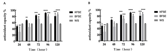 In vitro antioxidant activities of each experimental group. (A) Resistance of each experimental group to DPPH during different time intervals (24, 48, 72, 96, and 120 h). (B) Resistance of each experimental group to ABTS during different time intervals (24, 48, 72, 96, and 120 h). Values presented are the means ± standard deviation (N = 3/group). KFSE: The fermentation solution fermented by Lactobacillus plantarum (LP)-KFY02; BFSE: The fermentation solution fermented by Lactobacillus delbrueckii subsp. bulgaricus; and WS: The solution extracted by ethanol. * stands for p < 0.05, ** stands for 0.05 ≤ p < 0.01, **** stands for 0.01 ≤ p < 0.001, and **** stands for 0.001 ≤ p < 0.0001.
