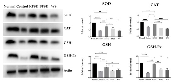 Table 3 shows that SOD, CAT, GSH, and GSH-Px mRNA (messenger RNA) levels decreased compared with normal levels. Compared with the control, KFSE significantly increased the expression of SOD, CAT, GSH, and GSH-Px, which play representative roles in oxidative damage of cells. Moreover, the expression of other products was also significantly affected after 48 h when compared with that of the control. The same result was also found in the protein expression level (Figure 4). We showed that KFSE increased SOD, CAT, GSH, and GSH-Px protein expression after H2O2 damage. In addition, BFSE and WS also significantly increased the protein levels of SOD, CAT, GSH, and GSH-Px compared with that of the model. Overall, our results confirmed the protective effect of KFSE in 293T oxidative damage.