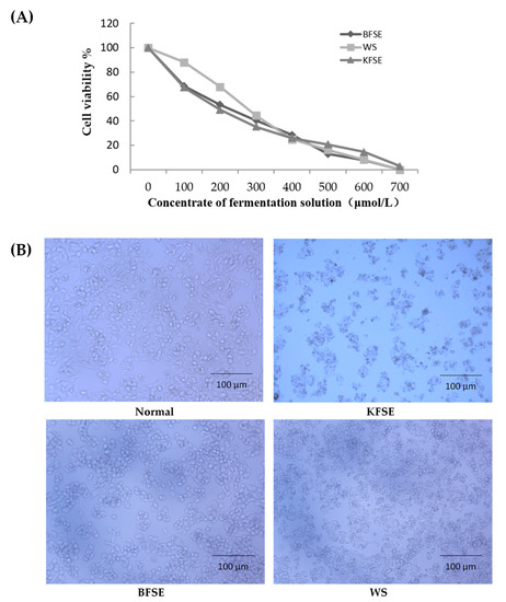 Effect of KFSE on HepG2 cell survival rate and the effect on cell morphology. (A) Effect of treatment with grape skin fermentation solution for 48 h on the survival rate of HepG2 cells. (B) Effect of treatment with grape skin fermentation solution for 48 h on the morphology of HepG2 cells (200×). KFSE: The fermentation solution fermented by LP-KFY02; BFSE: The fermentation solution fermented by Lactobacillus delbrueckii subsp. bulgaricus; and WS: The solution extracted by ethanol.