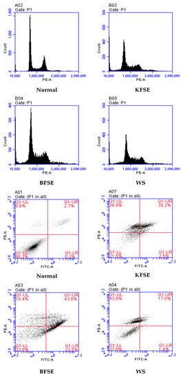 Cell cycle analysis demonstrated that KFSE significantly (p ≤ 0.05) arrested cells during the G1 to G2 phase transition at 300 μmol/L KFSE compared to that of the control after 48 h (Figure 6). Moreover, PI analysis demonstrated that KFSE also significantly induced apoptosis. This was confirmed by Annexin V-FITC/PI analysis (FITC: Fluorescein Isothiocyanate, PI: Propidium Iodide) (Figure 6). After KFSE treatment of HepG2 cells for 48 h, the detectable cell survival rate was only 24%, and more than 53.4% of cells were in advanced apoptosis and complete apoptosis.