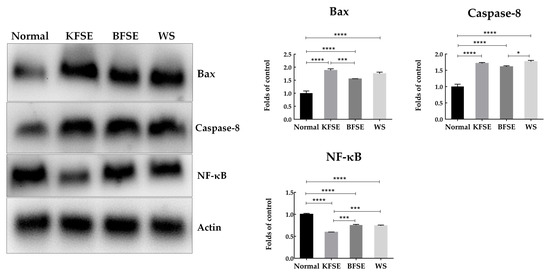 The levels of Bax, Caspase-8, and NF-κB proteins determined by western blot analysis are shown in Figure 7. Compared with the levels of the normal group, the protein levels of Bax and Caspase-8 in the KFSE treatment group were significantly increased, and the level of NF-κB protein was decreased. The same results were also found in the BFSE and WS treatment groups, which significantly increased levels of the apoptotic proteins Bax and Caspase8 and decreased the protein expression of the inflammatory factor NF-κB.