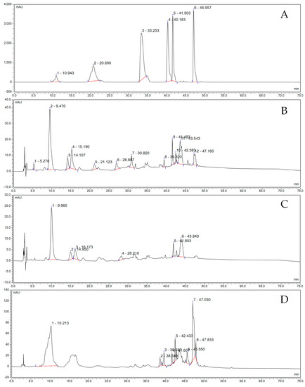 Polyphenol constituents of the fermented grape solution. (A) Standard chromatograms; (B) KFSE chromatograms; (C) BFSE chromatograms; and (D) WS chromatograms. 1: Epicatechin gallate (EGCG); 2: Coumarin; 3: New chlorogenic acid; 4: Rutin; 5: Resveratrol; and 6: Chlorogenic acid. KFSE: The fermentation solution fermented by LP-KFY02; BFSE: The fermentation solution fermented by Lactobacillus delbrueckii subsp. bulgaricus; and WS: The solution extracted by ethanol.