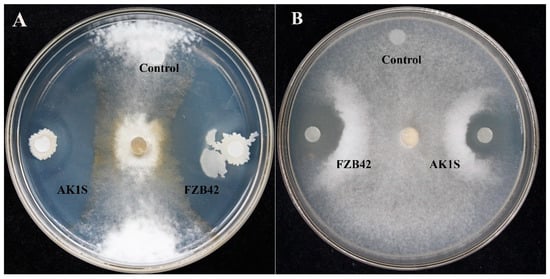 Antifungal activity of bacterial cultures and their crude extracts against S. sclerotiorum on Potato Dextrose Agar (PDA) medium: (A) direct antifungal activity of Bacillus amyloliquefaciens FZB42 wild type and AK1S mutant, and (B) antifungal activity of crude extracts from FZB42 and AK1S mutant.