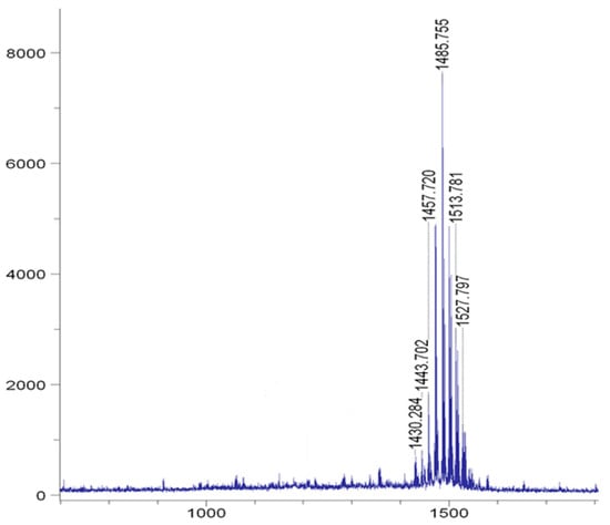 Purified fengycin extracted from AK1S mutant (which is a double mutant and can produce fengycin D only and is unable to produce surfactin and bacillomycin D) was detected through HPLC and identified by MALDI-TOF-MS analysis. HPLC is widely used for the detection and high-quality purification of compounds in the fields of medicines and cosmetics [43]. HPLC and MALDI-TOF-MS have been used simultaneously for the extraction, purification, and detection of fengycin from B. subtilis CMB32 in an earlier report [44]. The detection of lipopeptides from whole-cell surface extracts of Bacillus species through MALDI-TOF-MS has been previously reported [45,46]. In this investigation, MALDI-TOF-MS confirmed the presence of C14, C16, and C17 homologues of fengycin produced by AK1S mutant. The range of masses belonging to fengycin observed in our study is similar to that of previous reports, where masses of m/z 1485 and 1527 [24], and 1513.78 were reported for fengycin [33]. Fengycin peaks that appear in a mass range of m/z 1400-1600 have been successfully detected by MALDI-TOF-MS in single protonated forms [43,47,48,49]. In support of our work, the detection of purified fengycin produced by AK1S mutant of B. amyloliquefaciens FZB42 through HPLC and its identification through MALDI-TOF-MS have been reported in a previous study from our lab [11].