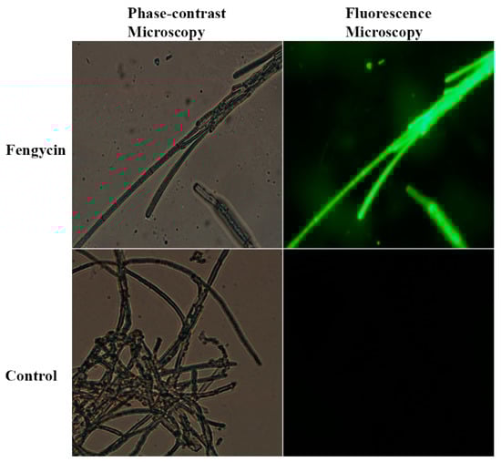 The effect of purified fengycin on the accumulation of ROS in fungal hyphae was assessed by using a DCFH-DA kit for ROS detection in fungal mycelium (Figure 6). Stronger green fluorescence was observed in the hyphae treated with fengycin compared to the untreated control. The green fluorescence was not only restricted to a few hyphae, but also expanded throughout the fengycin-treated mycelial network compared to the control treatment.