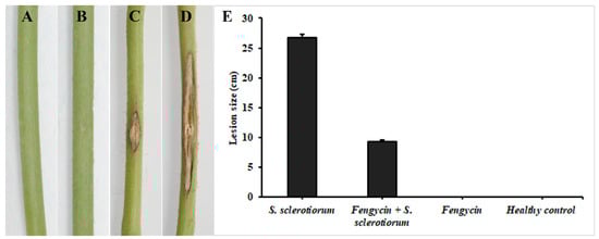 Fengycin-induced systemic resistance (ISR) in tomato plants against S. sclerotiorum. (A) healthy control, (B) fengycin only, (C) fengycin + S. sclerotiorum, (D) S. sclerotiorum only (infected control), and (E) lesion size (cm). Mean values were analyzed and separated by Tukey’s HSD test at p ≤ 0.05 after one-way ANOVA. Error bars represent standard error ± SE of the mean.
