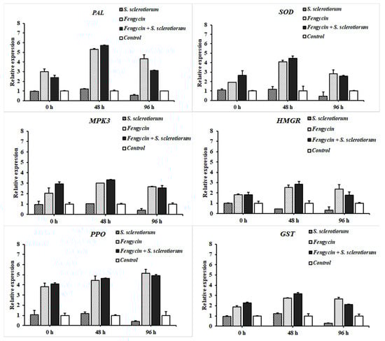 The expression of defense-related genes was studied in tomato plants through RT-qPCR analysis at 0, 48, and 96 hpi. The results revealed the differential expression of genes involved in the defense activation of tomato plants in a time frame analysis (Figure 9). The highest expression of genes, including PAL, GST, SOD, HMGR, and MPK3, was observed at 48 hpi in plants treated with fengycin. Interestingly, tomato plants treated with fengycin and challenged with the pathogen showed maximum upregulation of these genes after 48 hpi compared to the plants treated with fengycin only. However, the expression of these genes was downregulated at 96 hpi in fengycin + S. sclerotiorum treatment compared to the plants treated with fengycin only. Moreover, unlike other genes, PPO showed a varied pattern as its expression kept increasing in a linear manner up to 96 hpi in fengycin-treated plants. Furthermore, the expression of all genes was significantly downregulated in plants infected with S. sclerotiorum only at 96 hpi compared to the healthy control.