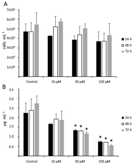 Cell number (A) and chlorophyll a content (B) of cultures treated with 0 (control), 10, 30, and 100 µM HgCl2 for 3 h, 6 h, 24 h, 48 h, and 72 h. N = 3 ± Standard Deviation (SD). Asterisks indicate significant differences compared to the corresponding control value, for p < 0.05.