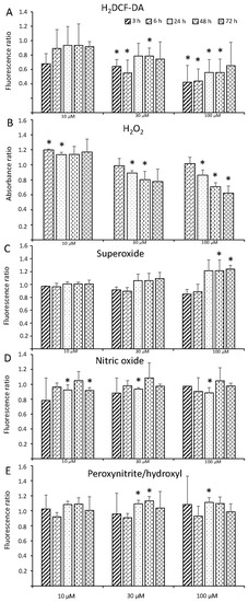 Finally, we used the dye APF to quantify ONOO− and/or ⋅OH, since the marker is unable to discriminate between the two reactive molecules. Also, in this case, fluorescence did not vary much among treatments, although it slightly increased at 24–48 h for 30 and 100 µM treatments (Figure 2E). ONOO− forms by reaction of NO with O2−. Since NO levels did not vary during treatment, it was not surprising that ONOO− levels were likewise stable.