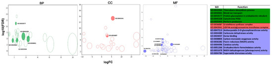 A bubble plot of the annotated differentially expressed genes (DEGs) gene expressions and gene ontology (GO) classification. The results summarized in three main categories: Biological process (BP), cellular component (CC), and molecular function (MF).