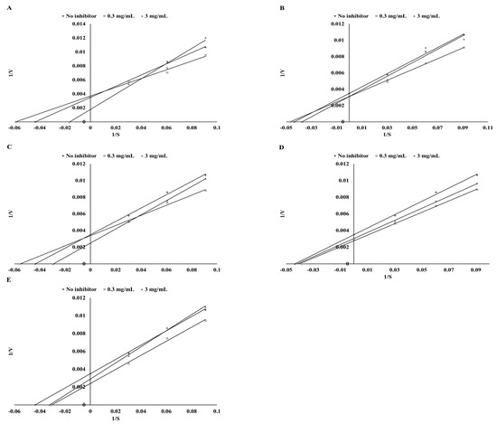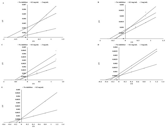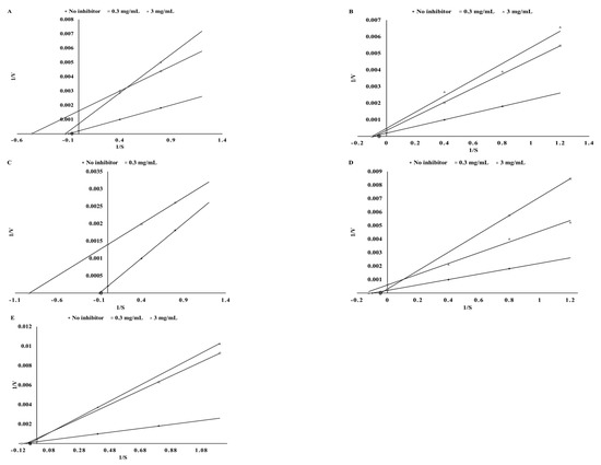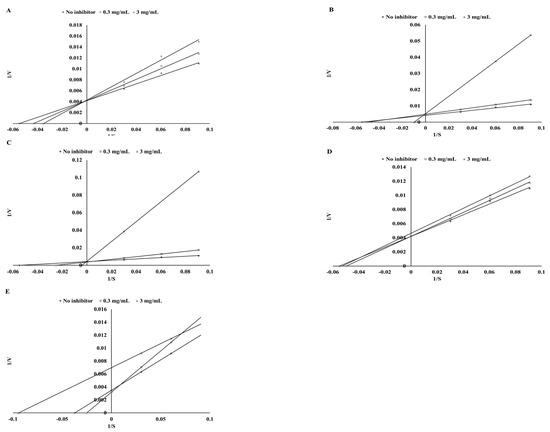 Mode of LOX inhibition by digested extracts from parsley (A), green coffee (B), green tea (C), cumin (D), and mustard (E).