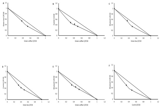 Dose-normalized isobolograms for digested extracts from green tea and green coffee (A), cumin and green coffee (B), mustard and green tea (C), cumin and green tea (D), mustard and green coffee(E), mustard and cumin (F) affecting TPO activity.