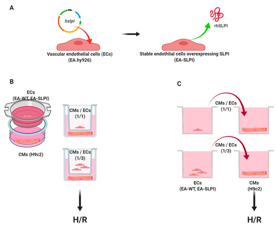 In the conditioned medium experiments, wild-type (EA-WT) or SLPI-overexpressing EA.hy926 cells (EA-SLPI) were seeded at density 1.5 × 104 cells/well (for the 1CM/1EC group) or 4.5 × 104 cells/well (1CM/3EC group) into 24-well tissue culture plates for 48 h. Then, the conditioned medium was collected. The H9c2 cells at were seeded at density 1.5 × 104 cells/well for 24 h. Then, the H9c2 cells were incubated with conditioned medium of wild-type or SLPI-overexpressing EA.hy926 cells for 1 h prior to H/R (Figure 1C).