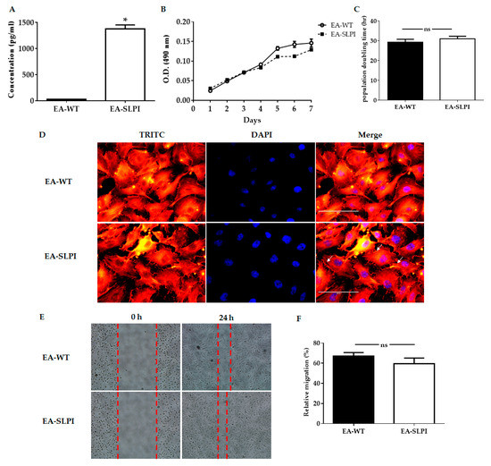 After establishing that EA.hy926 cells were able to overexpress SLPI (EA-SLPI), biological characteristics such as their growth curve, population doubling time (PDT), and cell morphology were measured and compared to wild-type EA.hy926 cells (EA-WT). The cell proliferation of EA-WT cells and EA-SLPI cells was similar when determined by the growth curve (Figure 2B). The results showed that the PDTs of these cell lines were not significantly different (Figure 2C), while the cell morphologies of EA-WT cells and EA-SLPI cells were similar in terms of size and shape. However, the determination of cytoskeleton organization by Phalloidin–TRITC staining showed minor differences in EA-SLPI cells by increased actin filament density in the margins of the cells (white arrow) compared to the wild type (Figure 2D). Cell migration is one of the characteristics of endothelial cells, so cell migration ability was determined by wound healing assay. The results showed that EA-SLPI cells (59.56% ± 5.59%, p < 0.05) were not significantly different when compared to EA-WT cells (66.87% ± 3.78%, p < 0.05) (Figure 2E,F).