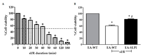 Determination of SLPI-overexpressing EA.hy926 cells in ischemia/reperfusion (I/R). (A) EA.hy926 cells were subjected to 10–180 min simulated ischemia (sI) followed by 24 h of reperfusion; (B) Wild-type (EA-WT) and SLPI-overexpressing (EA-SLPI) EA.hy926 cells were exposed to 40 min of sI followed by 24 h reperfusion, and the cell viability was determined by MTT. Each bar represents the mean ± SEM. * p < 0.05 vs. non-sI/R-treated group (ANOVA), # p < 0.05 vs. the sI/R-treated group (ANOVA, n = 3).