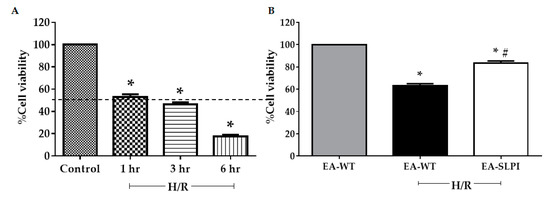 Determination of SLPI-overexpressing EA.hy926 cells in hypoxia/reoxygenation (H/R). (A) EA.hy926 cells were subjected to 1, 3, and 6 h hypoxia followed by 3 h of reoxygenation; (B) Wild-type (EA-WT) and SLPI-overexpressing (EA-SLPI) EA.hy926 cells were exposed to 1 h of hypoxia followed by 3 h reoxygenation, and the cell viability was determined by MTT. Each bar represents the mean ± SEM. * p < 0.05 vs. non-H/R-treated group (ANOVA), # p < 0.05 vs. H/R-treated group (ANOVA, n = 3).