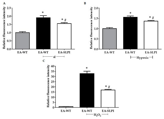 Determination of intracellular reactive oxygen species (ROS) levels in SLPI-overexpressing EA.hy926 cells. Wild-type (EA-WT) and SLPI-overexpressing (EA-SLPI) EA.hy926 cells were exposed to H2DCFDA followed by (A) sI/R or (B) H/R or (C) H2O2 challenge. Then, the intracellular ROS level was determined by spectrophotometry. Each bar represents the mean ± SEM. * p < 0.05 vs. nontreated group (ANOVA), # p < 0.05 vs. treated group (ANOVA, n = 3).