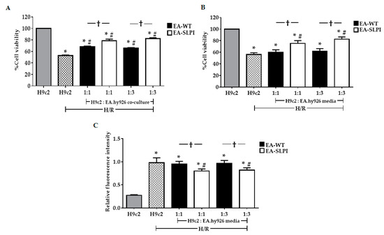 The effect of rhSLPI secreted from the endothelial cell line protected the cardiomyocyte cell line from hypoxia/reoxygenation. (A) Wild-type (EA-WT) and SLPI-overexpressing (EA-SLPI) EA.hy926 cells were co-cultured with the H9c2 cell line at ratios 1:1 and 1:3, then subjected to H/R, and the cell viability was determined by MTT; (B) The culture media from wild-type (EA-WT) and SLPI-overexpressing (EA-SLPI) EA.hy926 cells were transferred to culture H9c2 cells at ratios of 1:1 and 1:3; then, the cells were exposed to H/R and the cell viability was determined by MTT. After transferring the media from wild-type (EA-WT) and SLPI-overexpressing (EA-SLPI) EA.hy926 cells at ratios of 1:1 and 1:3 to the H9c2 cells, (C) the cells were exposed to H2DCFDA followed by H/R, and the intracellular ROS levels were determined by spectrophotometry. Each bar represents the mean ± SEM. * p < 0.05 vs. the H9c2 not subjected to H/R (ANOVA), # p < 0.05 vs. the H9c2 subjected to H/R (ANOVA), † p < 0.05 vs. the 1:1 or 1:3 culture ratio group (ANOVA, n =3).