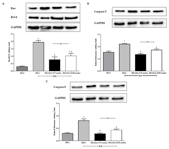 H/R increased the Bax/Bcl-2 ratio in H9c2 when compared to the control. By contrast, treatment with cultured medium from EA-WT cells and EA-SLPI cells significantly decreased the Bax/Bcl-2 ratio when compared to untreated H9c2 (Figure 8A). Furthermore, H/R also increased the expression of apoptotic regulatory enzymes caspase-3 and caspase-8 in H9c2 when compared to the control group (Figure 8B,C). Treatment with conditioned media from both EA-WT cells and EA-SLPI cells significantly reduced the expression of caspase-3 and caspase-8. Treatment of H9c2 with conditioned medium from EA-WT cells showed a greater reduction in the expression of caspase-3 and caspase-8, but the results were not significantly different from those for the EA-SLPI group.