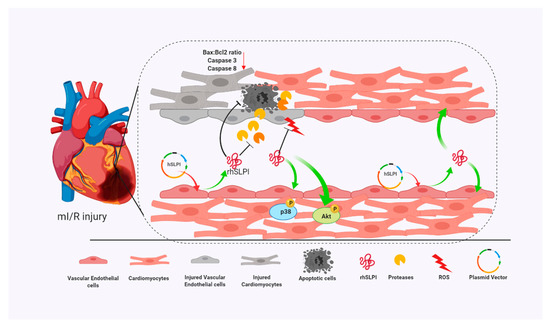 This is the first study to demonstrate that manipulation of ECs to secrete rhSLPI provides cardio-vasculoprotection against I/R and H/R injury. Preconditioning of endothelial-derived rhSLPI via activation of Akt and p38 MAPK has the potential to reduce both CM and EC death by the attenuation of intracellular ROS production, Bax/Bcl-2 ratio, caspase-3, and caspase-8.