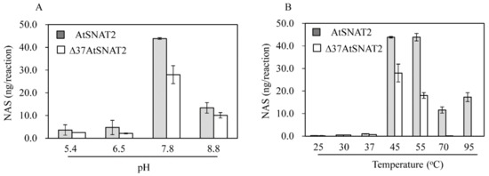The pH and temperature optima in terms of enzymic activity were determined. Figure 4 shows that the total SNAT activity of the full-length protein was greater than that of the truncated protein under all conditions tested. The optimal pH values in terms of activity were pH 7.8 for both proteins, followed by pH 8.8 (Figure 4A). SNAT enzyme activity was 10-fold lower in the pH range pH 5.4–6.5 than at pH 7.8. Optimal SNAT enzyme activity at relatively high pH values is characteristic of other plant SNAT2 enzymes [30,31]. The optimal temperatures for activity were 45 ℃ and 55 ℃ for AtSNAT2, but only 45 ℃ for Δ37AtSNAT2. Surprisingly, AtSNAT2 retained 30% of its peak activity even at 95 ℃; Δ37AtSNAT2 exhibited no activity at that temperature (Figure 4B). Neither the truncated rice nor grape enzyme exhibited any activity at 95 ℃ [30,31]. In contrast, rice Δ83SNAT1 exhibited enzyme activity comparable to that of AtSNAT2 at 95 ℃ [35], implying that plant SNAT enzymes are more thermostable than other melatonin biosynthetic enzymes such as ASMT [35].