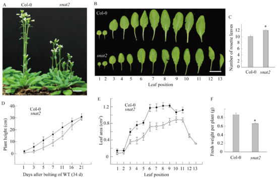 Delayed flowering of the Arabidopsis snat2 knockout mutant. (A) Phenotypes at flowering. (B) The rosette leaf phenotype. (C) The rosette leaf numbers of the wild-type Col-0 and the snat2 mutant. (D) Stem lengths over time and a comparison of rosette leaf areas. (E) Leaf lengths over time. (F) Biomass values (n = 10). Stem lengths were measured after the wild type commenced bolting (about 34 d after germination). Bars: 1 cm. Asterisks (*) denote significant differences compared to the wild-type Col-0 (Student’s t-test; p < 0.05).