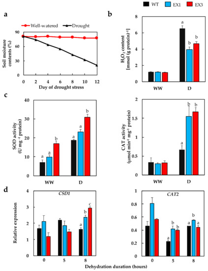 The data were analyzed by using the Student’s t-test (significant differences with p-value < 0.05 were indicated by asterisks) for comparison between WT and each EX line, or one-way ANOVA using SPSS software (significant differences with p-value < 0.05 were indicated by different letters according to Duncan’s multiple range test) for comparison among all genotypes.