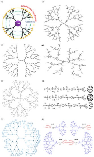 Commonly used dendritic macromolecules in drug delivery: (a) A schematic diagram revealing the three components of a dendrimer molecule and chemical structures of (b) polyamidoamine (PAMAM), (c) polypropyleneimine (PPI), (d) poly-l-lysine (PLL) dendrimers, and (e) carbosilane dendrimers; (f) examples of cores of phosphorus (PPH) dendrimers, (g) glycodendrimers, and (h) Janus dendrimers. Figure 1b–h is reproduced with permission from References [,,,,].