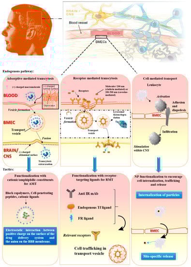 Noninvasive central nervous system (CNS) drug-delivery tactics that leverage endogenous pathways to traverse the blood–brain barrier (BBB): The major pathways incorporate adsorptive-mediated transcytosis (AMT), receptor-mediated transcytosis (RMT), and cell-mediated transport are presented. Modified and reproduced with permission from Reference [].