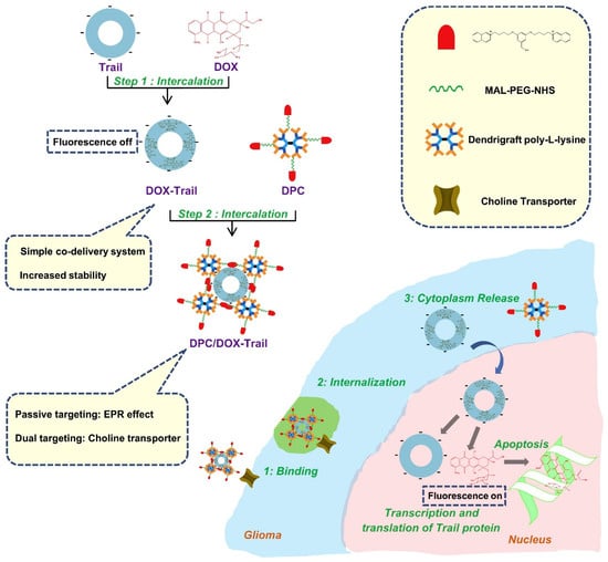 Construction of dual targeting and co-delivery system: Doxorubicin (DOX) was embedded into the TRAIL (tumor necrosis factor-related apoptosis-inducing ligand) plasmid to generate a steady composite, which was further condensed by choline-derivate modified DGL. This co-delivery system could accumulate into glioma cells through EPR and dual targeting effect. After cytoplasm releasing, TRAIL and DOX exert combination therapy on glioma. Reproduced with permission from Reference [].
