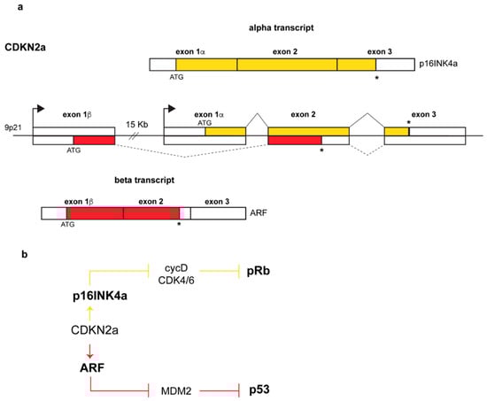The alpha transcript encodes the p16INK4a protein, a member of the INK4 family of inhibitors of the cyclin-dependent kinases 4 and 6 (Inhibitor of CDK4). In response to specific signals, they block the assembly and/or inhibit the kinase activity of the cyclin D-CDK4/6 complex required for G1 to S cell cycle progression [6,7]. In this way, the retinoblastoma protein pRB is maintained in an active hypo-phosphorylated state and sequesters the transcription factors of the E2F family causing G1-phase cell cycle arrest [7,8] (Figure 1b). The ARF protein instead inhibits the functions of the MDM2 oncoprotein (Mouse Double Minute 2, HDM2 in human) thus inducing p53 stabilization and the activation of p53-dependent pathways (Figure 1b).