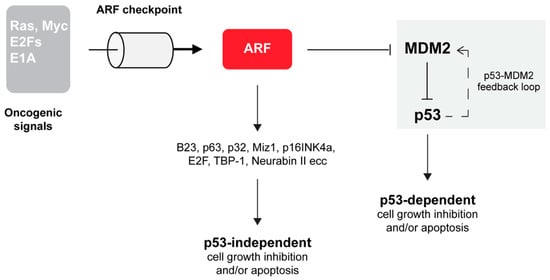 ARF involvement in tumor suppression relies on p53-dependent and independent pathways. Upon over-expression of oncogenes (such as E2F, Ras, E1A and Myc), an increase of ARF intracellular levels are promptly observed (ARF checkpoint) in the cell. By inhibiting MDM2 functions, ARF interferes with the p53/MDM2 circuit (highlighted in grey), leading to p53 stabilization followed by cell cycle arrest and/or apoptosis [10,32,33,34,35,39]. ARF is able to block cell growth also in a p53-independent manner, through the functional interaction with several molecular players as indicated.