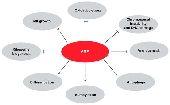 Synopsis of the effect of ARF in cellular processes. Note that the ARF negative effect on cell growth includes its ability to block cell proliferation and to induce apoptosis or senescence.