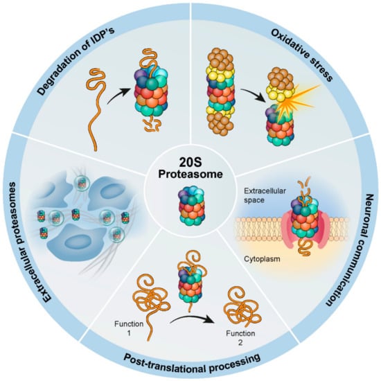 In the past, individual case studies have pointed to proteins susceptible to 20S-mediated degradation (reviewed in Reference [5]). For example, the tumor suppressors p53, p73, and retinoblastoma protein, the proto-oncoprotein c-Fos, the cell cycle regulators p27 and p21, and the neurodegenerative disease-related proteins tau and α-synuclein [5,11,87] have been identified as substrates of the 20S proteasome [9]. Interactions of such IDRs with partner proteins can, however, protect them from 20S proteasomal activity [84]. The 20S proteasome substrate landscape is further broadened by the fact that feeding the proteins into the 20S proteasome is not restricted to the proteins’ termini, since evidence exists for endoproteolytic activity of internal disordered regions as well [88].