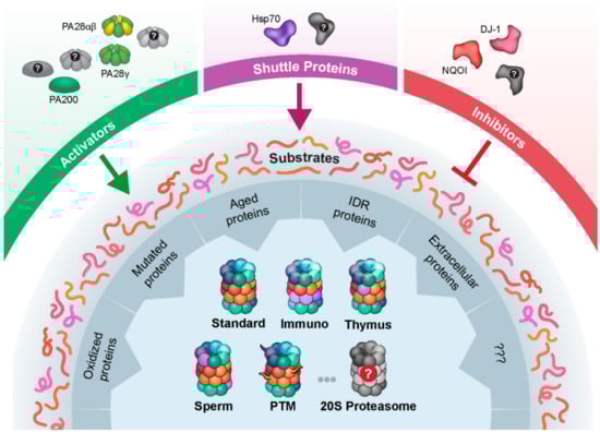There are many unknown elements in the 20S proteasome degradation pathway. The scheme summarizes the different substrate groups, 20S proteasome forms, activators, inhibitors, and shuttle proteins, and point toward the many entities among these players that are yet to be discovered. HSP70: heat shock protein 70, IDR: intrinsically disordered proteins, PTM: post translational modification.