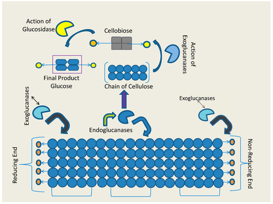 The continuous and increasing usage of fossil fuels has led to their depletion. Moreover, it has introduced various environmental hazards in the form of pollutants [1]. Bioenergy has been declared by the International Energy Agency (IEA) as the highest source of growth, at ~30% in the renewable consumption sector over the period of 2018–2023 [2]. In the year 2017, solar, hydropower, wind, and bioenergy covered ~25% of the power demand [3] around the world. In spite of having multiple renewable energy sources, consistent energy production and even supply are not ensured, because of climate dependency [4]. In this context, biomass degradation and their conversion in to biofuels seems an impressive and promising option, as cellulosic biomass is abundantly available and it is renewable as well [5,6,7,8]. Lignocellulosic biomasses are present in most of a plant’s cell walls, and hence it marks its presence in a plentiful amount [4]. Examples of such lignocellulosic biomasses are waste materials like forest residues, and agricultural, municipal, and industrial activities. Additionally, they can also be grown as energy crops that do not compete with food crops [9,10]. In general, the lignocellulosic biomass is comprised of two polysaccharides—cellulose, a homo-polysaccharide, and hemicelluloses, a hetero-polysaccharide. In addition, an aromatic hydrocarbon lignin is also present, along with a smaller portion of ash, proteins, and pectin [4]. Cellulose is a high molecular weight linear polymer composed of β-glucose (5000–10,000 units) and linked by β-1,4-glycosidic bonds [11]. Moreover, cellulose is highly crystalline in nature, and that makes it challenging to convert into monomeric sugars through the hydrolysis process [12]. Hemicellulose contains approximately 150 repeating monosaccharide (C5 and C6 sugar) units, and the type of monomeric sugars present therein varies depending on the types of materials [11]. In general, before the hydrolysis of a biomass, pretreatment is required so as to break the lignin present in the outermost layer of the biomass. The pretreatment of lignocellulosic biomasses can be done by following physical, chemical, and biological methods using chemicals or enzymes. Nevertheless, these treatment methods may result in the partial or complete removal of the lignin, and release the free structure of cellulose and hemicellulose, which can be further converted in to sugars by enzymes, and subsequently in to fuels, following fermentation using various types of microorganisms [13].
