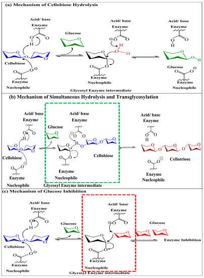 The possible mechanism of hydrolysis along with transglycosylation has been described in Figure 3. The –OH group of cellobiose performs a nucleophilic attack on the enzyme–glycosyl intermediate, and delivers the cellotriose and glucose with the (E-Glu1) transient glycosyl enzyme intermediate [131]. This nucleophilic attack ultimately results in the hydrolysis and transglycosylation reactions to occur simultaneously [151].