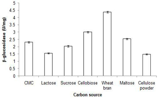 Nascimento et al. worked on Humicola grisea var. thermoidea for the production of β-glucosidase, and noticed that the highest yield of β-glucosidase was achieved when avicel (microcrystalline cellulose) was used as a substrate, but sugarcane bagasse was able to produce the BGL with the highest specific activity [184]. In a study on Aspergillus sachharolyticus, Sorensen et al. screened various carbon sources, ranging from simple monomers, such as xylose and polysachharide, like xylan, to complex substrates of lignocellulosic biomasses, such as corn cobs [185]. The findings of their study described wheat bran as the best substrate, giving highest β-glucosidase production and highest activity, and noticed that pretreated corn stover as a potential substrate. In a study, Zahoor et al. [73] worked on A. niger NRRL 599, and explored the effect of different carbon sources on the production of β-glucosidase (Figure 4) [73].