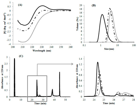 The physicochemical characterization of DEN4 ED3-1st sup (solid line); DEN4 ED3-2nd sup (dotted dashed line); DEN4 ED3-3rd sup (dotted line) at the protein concentration of 20 µM. (A) Circular dichroism (CD) spectra at pH 8 and 20 °C. (B) Size-volume graphs measured by dynamic light scattering (DLS) at pH 8 and 20 °C. (C) Reverse phase high performance liquid chromatography (RP-HPLC) chromatograms at pH 8 and 30 °C. The flow rate was kept as 1 mL/min.
