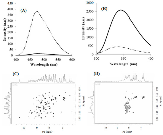(A) 8-Anilinonaphthalene-1-sulfonic acid (ANS) fluorescence spectra and (B) Tryptophan fluorescence spectra of DEN4 ED3-1st sup (solid line) and DEN4 ED3-3rd ppt (dotted line) at pH 5.0 and 20 °C (C), (D): HSQC spectra of 15N-labelled DEN4 ED3-1st sup (C) and DEN4 ED3-3rd ppt (D) at 0.2 mg/mL, pH 5.0 and 25 °C.