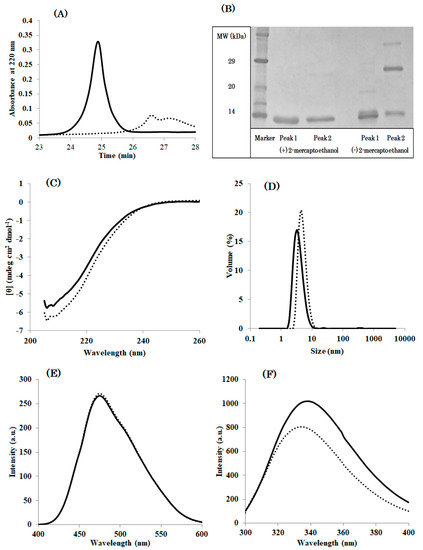 Further examination of Peak 1 (solid line) and Peak 2 (dotted line) obtained at RP-HPLC of DEN4 ED3-3rd ppt. (A) RP-HPLC chromatograms of two peaks. (B) SDS-PAGE result of two peaks in the presence or absence of 2-mercatptoethanol. (C) CD spectra at pH 5 and 20 °C. (D) Size-volume graphs measured by DLS at pH 5 and 20 °C. (E): ANS fluorescence spectra at pH 5.0 and 20 °C. (F) Tryptophan fluorescence spectra at pH 5.0 and 20 °C.