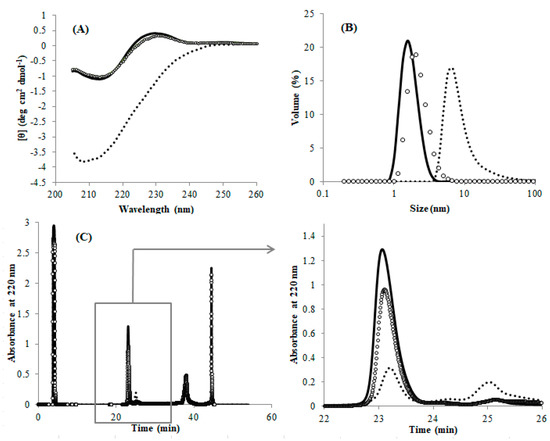 Physical properties of DEN4 ED3-1st sup (solid line); DEN4 ED3-3rd ppt (dotted line); DEN4 ED3-3rd ppt after the incubation with 100 mM DTT (white circle) at a protein concentration of 20 µM. (A) CD spectra at pH 5 and 20 °C. (B) Size-volume graphs measured by DLS at pH 8 and 20 °C. (C) RP-HPLC chromatograms at pH 8, 30 °C and a flow rate of 1 mL/min.