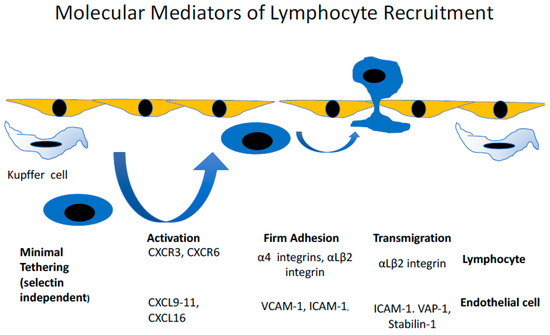 The molecular mechanisms of lymphocyte trafficking in liver disease. The recruitment of lymphocytes in the hepatic sinusoids is mediated by a combination of surface receptors and chemoattractant cytokines. In conventional recruitment, lymphocytes undergo a rolling step that is mediated by selectins. Selectins are absent in the sinusoidal channels, and after a brief tethering, lymphocytes undergo activation and firm adhesion mediated by a combination of chemokines presented on the endothelium and binding to chemokine receptors on the lymphocyte surface (for example, the inflammatory chemokines CXCL9, 10, and 11 binding to the chemokine receptor CXCR3, or the chemokine CXCL16 binding to CXCR6). Following activation, the lymphocytes bind via integrins to intercellular adhesion molecule-1 (ICAM-1) and vascular cell adhesion molecule-1 (VCAM-1). The final step is transendothelial migration, which has been shown to be mediated by ICAM-1, vascular adhesion protein-1 (VAP-1), and stabilin-1.