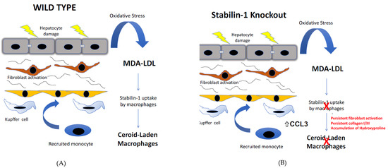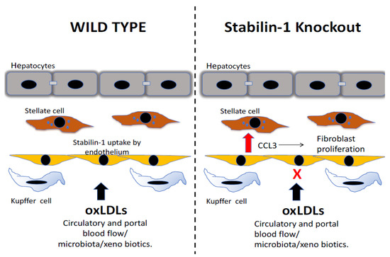 The scavenging role of stabilin maintains homeostasis in the liver by the uptake of products of oxidative stress. Stabilin-1 contributes to the hepatic uptake of circulating oxidized low-density lipoproteins (oxLDLs). In the setting of stabilin-1 deficiency, these oxLDLs lead to a proinflammatory response specifically, leading to increased levels of the chemokine CCL3, which drives the proliferation of liver-resident fibroblasts and causes an increase in collagen fibres in the livers of stabilin-1 knockout mice.