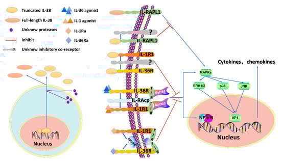 IL-38 signaling pathways. The N-terminus of IL-38 requires cleavage, but which protease(s) is responsible remains unknown. The process may involve an intra- or extracellular protease(s). IL-38 is mainly reported to exist in two forms—a truncated form and a full-length form. However, which form(s) of IL-38 is naturally present in the human body remains unknown. Interleukin-1 receptor 1 (IL-1R1) and IL-36R are activated by the agonists IL-1 and IL-36, respectively. The heterodimeric receptor complex consisting of IL-1R1 or IL-36R and interleukin-1 receptor accessory protein (IL-1RAcP) results in myeloid differentiation primary response 88 (MyD88) recruitment through the intracellular toll-interleukin 1 receptor (TIR) domain, and the downstream signaling pathways that are activated include (A) the nuclear factor kappa B (NF-κB) pathway and (B) the mitogen-activated protein kinase (MAPK) pathway through extracellular regulated protein kinases (ERK), p38 or c-Jun N-terminal kinase (JNK), which stimulate the activator protein-1 (AP-1). NF-κB and AP-1, then bind DNA and stimulate the production of pro-inflammatory cytokines and chemokines. In contrast, IL-38 acts as an antagonist of IL-1R1 and IL-36R, restraining the recruitment of IL-1RAcP and the binding of agonists, similar to what occurs for IL-1Ra and IL-36Ra. IL-1Ra and IL-36Ra recruit the inhibitory receptor single immunoglobulin IL-1R-related molecule (SIGIRR), which interferes with the TIR domain to exert antagonist properties, it remains unknown whether IL-38 can recruit SIGIRR. In addition, truncated IL-38 antagonizes IL-RAPL1 by recruiting a not-yet-identified inhibitory coreceptor and suppressing the JNK/AP1 pathway, full-length IL-38 activates the pathway.