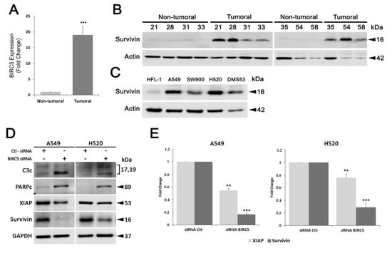Survivin expression levels in lung cancer tumor samples and survivin functional validation in cellular models. (A) qPCR validation of BIRC5 expression levels. Fold changes of gene expression were calculated using β-actin as the housekeeping gene. (B,C), survivin levels were analyzed using whole cell lysates from patient tissue samples and lung cell lines by Western blot analysis. (D,E), After 48 h of transfection with siRNA against survivin mRNA, the expression of survivin, XIAP and pro-apoptotic proteins was analyzed by Western blot analysis in A549 and H520 cell lines. Protein levels were normalized with their respective loading controls in each blot. Results were obtained from at least three independent experiments. Bars represent the mean ± SD. Statistically significant results are indicated as *, p-value < 0.05; **, p-value < 0.01 and ***, p-value < 0.001. C3c, cleaved caspase 3; PARPc, cleaved PARP.