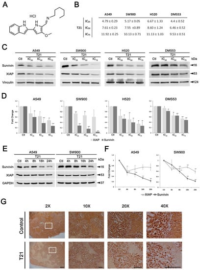 T21 decreases survivin levels in vitro and in vivo. (A) T21 chemical structure. (B) T21 inhibitory concentration (IC) values calculated in cell viability assays performed in several lung cancer cell lines. Some IC50 values were previously published in Manuel-Manresa et al. [6]. Values represent mean ± SD in µM. (C,D) After 24 h of treatment with IC25, IC50, IC75 values of T21 (Table S1), the expression of survivin and XIAP was analyzed by Western blot analysis in A549, SW900, H520 and DMS53 cell lines. (E,F) A549 and SW900 cells were treated with T21 at IC50 during different time periods (4, 8, 16, 24 h) followed by survivin and XIAP expression analysis through Western blot analysis. Results were obtained from at least three independent experiments. Bars represent the mean ± SD. Statistically significant results are indicated as *, p-value < 0.05; **, p-value < 0.01 and ***, p-value < 0.001. (G) Subcutaneous tumors from implanted DMS53 cells in Crl:NU-Foxn1nu mice were treated with 6 mg/kg of T21 every other day for 20 days. Tumor samples were stained against survivin by immunohistochemistry. Representative illustrations are shown at 2×, 10×, 20× and 40× magnifications, the scale bars correspond to 500, 500, 100 and 100 μm, respectively.