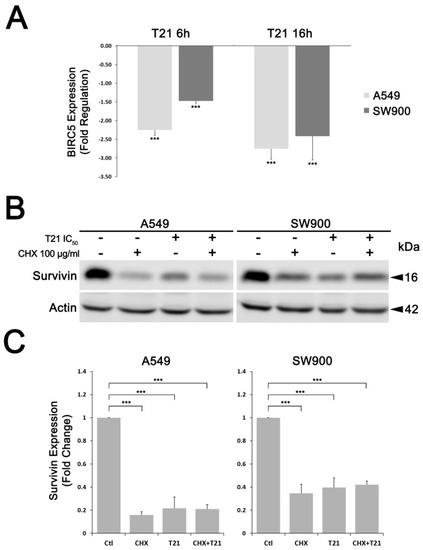 In order to identify the cellular mechanism that T21 was triggering to decrease survivin levels, A549 and SW900 cell lines were treated with T21 IC50 for 6 and 16 h and BIRC5 gene expression was analyzed by RT-qPCR. T21 was able to downregulate BIRC5 at both incubation periods albeit being more evident at 16 h, indicating that T21 represses survivin gene expression (Figure 3A).