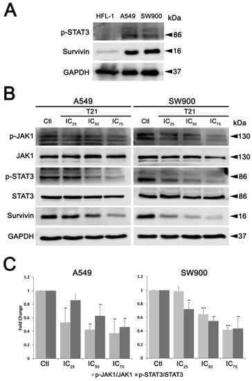 Then, in order to assess whether this pathway could be involved in survivin regulation after T21 treatment, STAT3 phosphorylation at Tyr705 (p-STAT Y705) was evaluated in SW900 and A549 cells after T21 exposure at their IC25, IC50 and IC75 for 24 h. This phosphorylation allows STAT3 dimerization, nucleus translocation from cytoplasm, and DNA binding [12]. Both cell lines showed a significant reduction in net phosphorylation of STAT3 at Tyr705 after T21 treatment in a dose-dependent manner (Figure 4B,C), similarly to that observed in survivin levels. Since STAT3 can be phosphorylated by JAK, upon IL-6 stimulation and gp-130 receptor activation, phosphorylation status of this upstream STAT3 activator was also evaluated. JAK1 showed a significant reduction on its phosphorylation state at Tyr1034/1035 (p-JAK1 Y1034/1035). Similarly, JAK2 phosphorilation decreased after T21 treatment (Figure S3). These results suggest that T21 inhibits STAT3 phosphorylation through JAK/STAT3 pathway, which may reduce the gene expression of survivin provoking the observed protein level decrease.