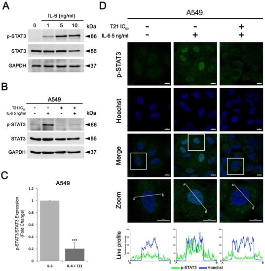 To examine whether T21 was also able to block STAT3 signaling after stimulating with one of its upstream ligands, we first analyzed the IL-6 effects on STAT3 phosphorylation in lung cancer cells. A549 cells, after starvation for at least 12 h to decrease the JAK/STAT signaling pathway, were stimulated with IL-6 at different concentrations for 30 min. STAT3 was activated by phosphorylation in a dose-dependent manner after IL-6 stimulation from 1 to 10 ng/mL (Figure 5A). In turn, the total STAT3 expression level was not altered with IL-6 stimulation. Next, in the same culture conditions after starvation, A549 cells were pretreated with T21 at IC50 for 4 h followed by 5 ng/mL of IL-6 stimulation for 30 min. The results showed that IL-6 treatment induced STAT3 phosphorylation, but this induction was almost totally repressed by T21 in pretreated cells, showing that T21 pretreatment impedes activation of this signaling pathway by IL-6 (Figure 5B,C).